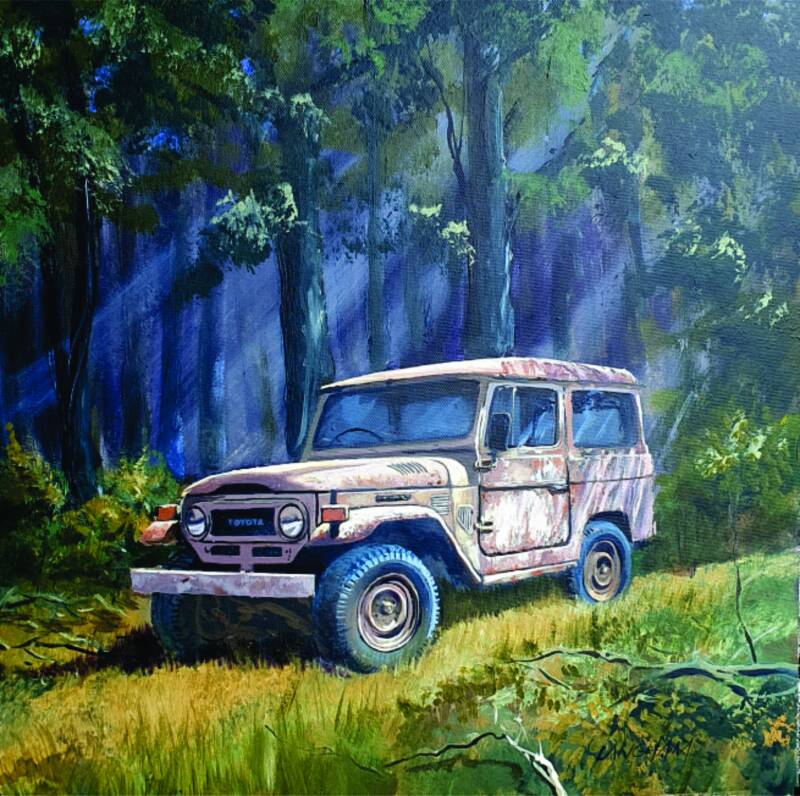 Landy this old landrover is the favourite of back country explorers, set on a river bed, New Zealand. Acrylic on canvas board 400 x 400