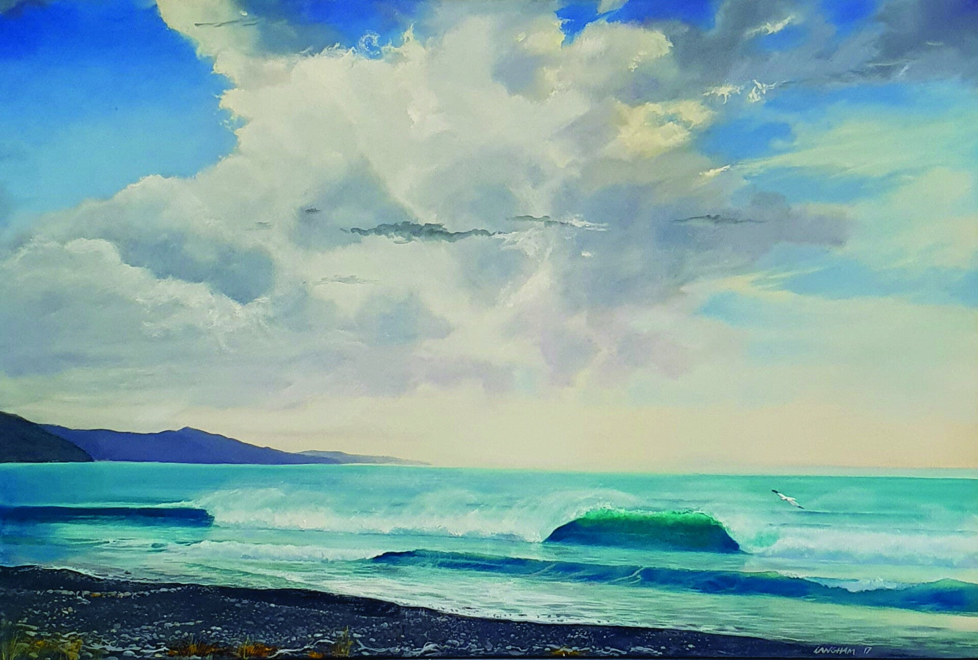 A study of cloud formations over Rarangi Beach, looking towards Port Underwood, New Zealand. Acrylic on canvas apx 850 x 700mm