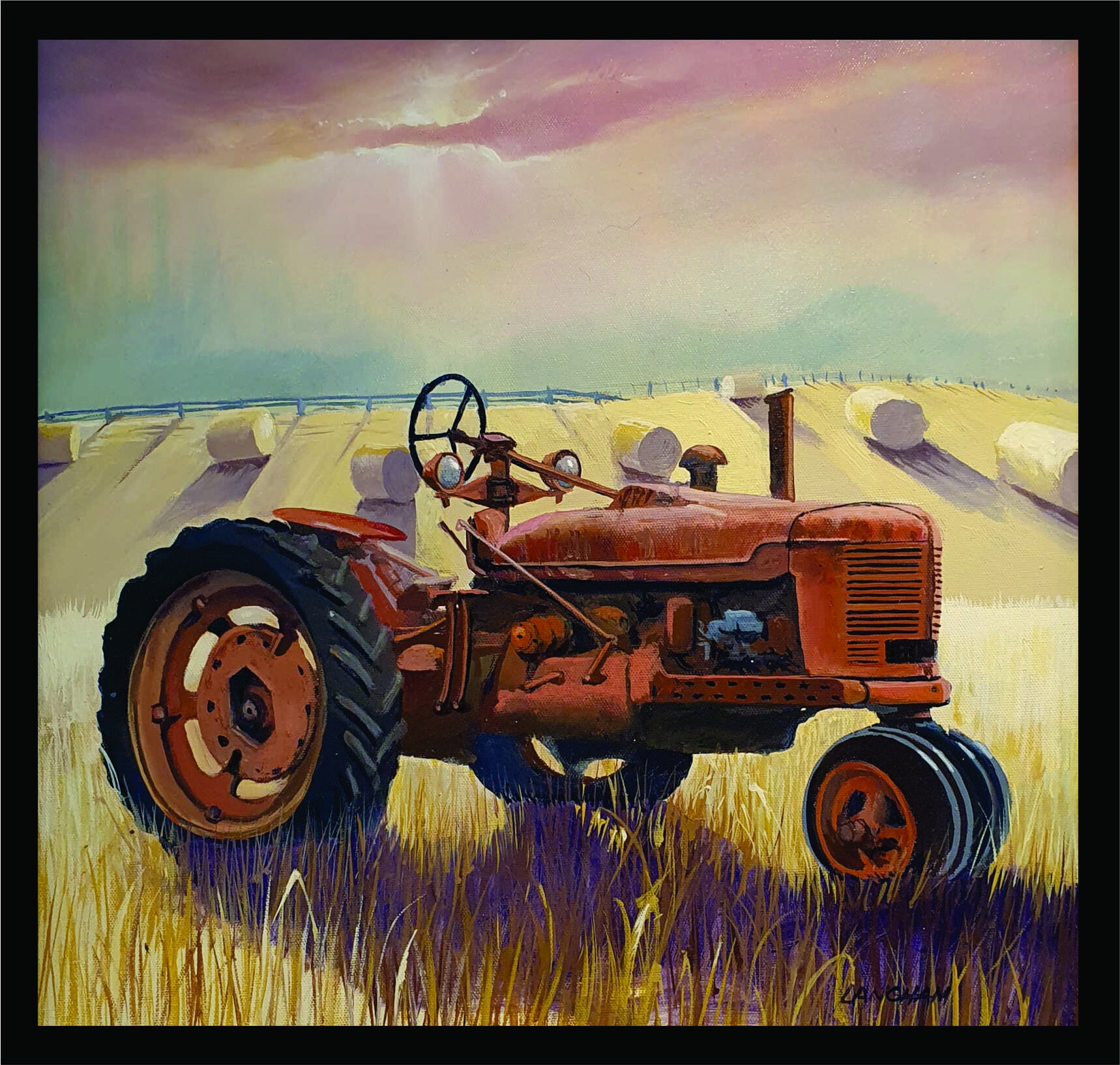 an old rusty tractor put out to pasture in its retirement years, acrylic on canvas board 400 x 400mm Framed