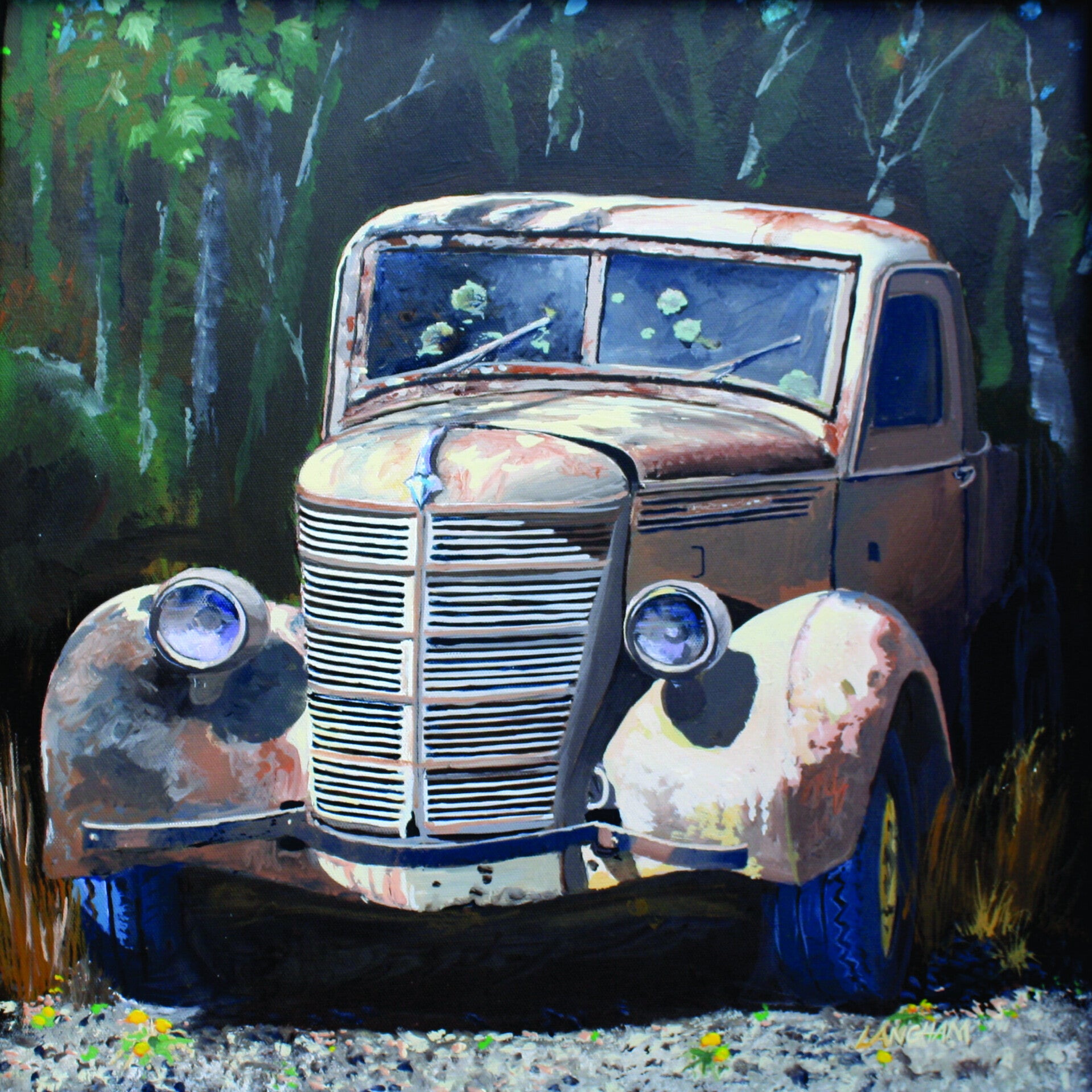 found this old truck down in Burkes Pass, New Zealand just had to paint it with all its patina and moss on the windows, acrylic on canvas board, 400 x 400mm, prints available