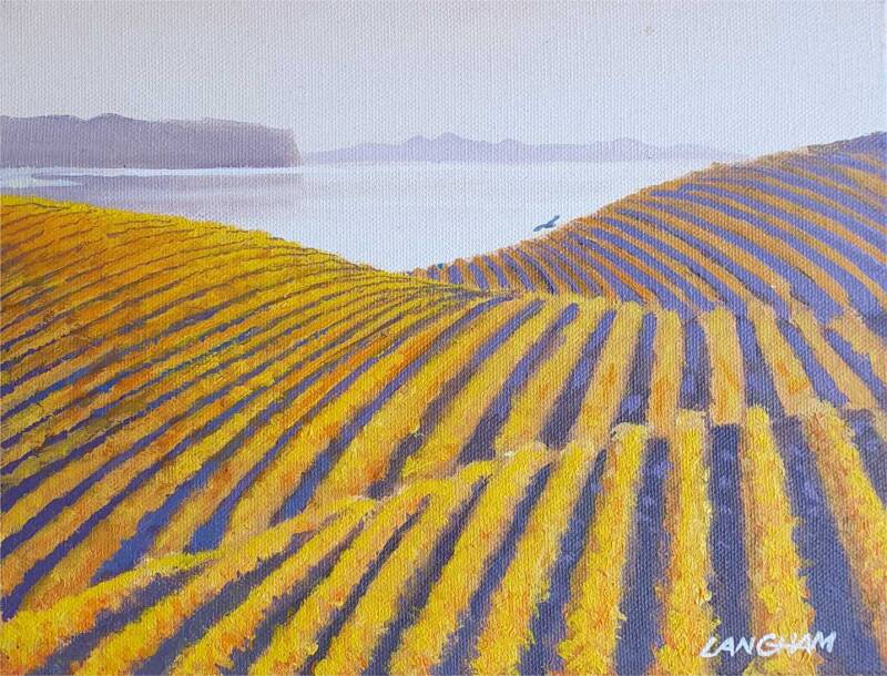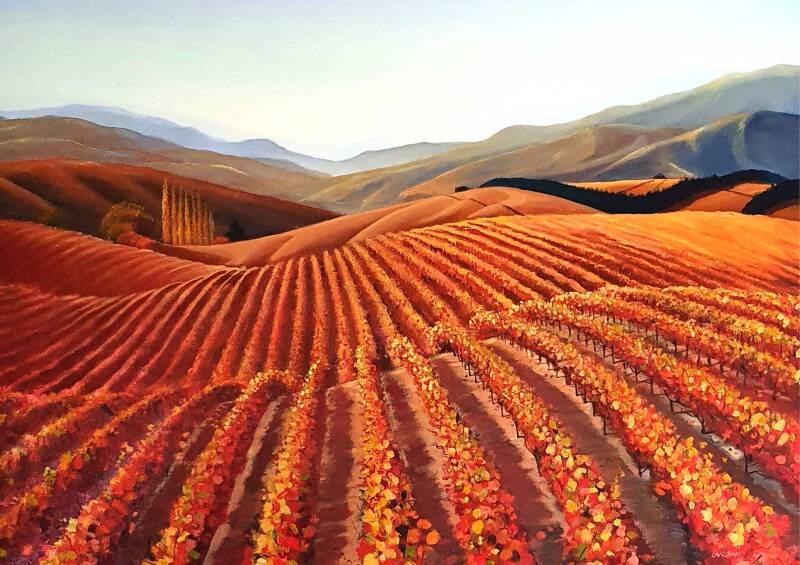 Vine Lines autumn colours of vineyards extending deep into the valley, set in Marlborough New Zealand this original painting has been sold but prints are available, contact me for details,